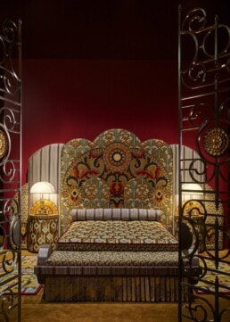 Intricately crafted, this box is embellished in decorative and narrative motifs: the sun, a symbol of light and prosperity, the wheat, a direct reference to the craft, and four cylindrical legs evocative of a tabernacle. “The Sun Chest” inspired Ahmed Terbaoui’s tale where a little boy and “the woman who has gold in her hands” make a chest from wheat straws to capture rays of the sun… A beautiful ode to master artisan Lison de Caunes who made this magical case.